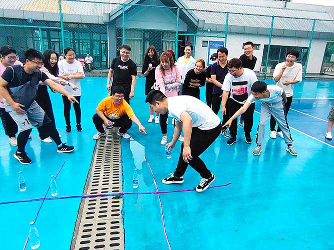 大家一排站好,從左到右,每人的右腿與另一人的左腿依次并齊,并用扁帶繩子系上,繩子綁的位置是腳踝以上部分。聽見哨聲即為游戲開始,從起點到終點,按用時由短到長,取前五名依次加分。