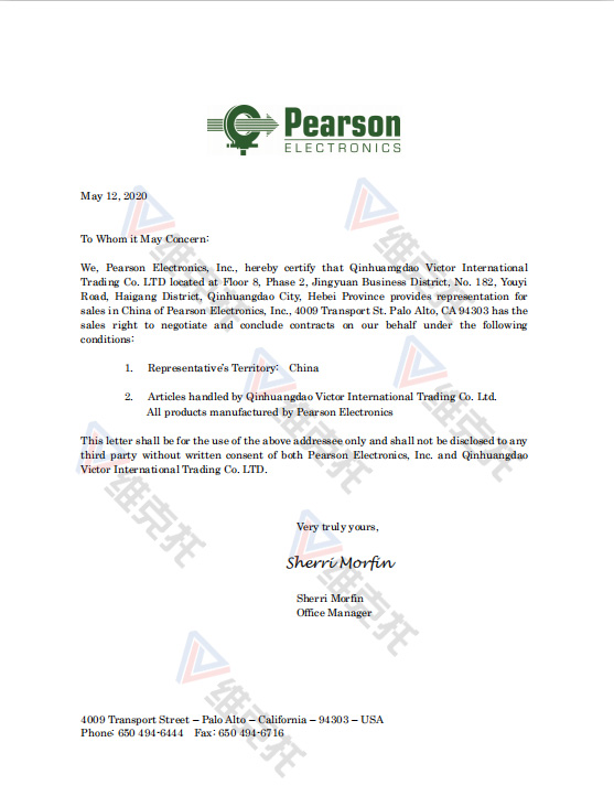 秦皇島維克托國際貿易有限公司于2020年5月12日取得了Pearson Electronics(皮爾遜電子)公司產品的代理權。我們是Pearson中國區代理商。主要代理產品有Pearson電流互感器、Pearson電流監控器等。如果您有Pearson Electronics(皮爾遜電子)產品的采購需求,請與我們聯系,我們會竭誠為您服務!