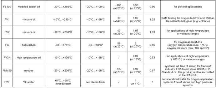 可提一定范圍的物質如壓力傳送液體,適用于特殊工作。請參考下表和恰當的數據,以獲得詳細信息。